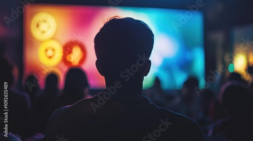 audience, presentation, screen, man, watching, silhouette, dark, auditorium, conference, seminar, business, technology, event, crowd, people, lecture, speaker, meeting, workshop, training, education, entertainment, video, digital, display, projector, light, night, stage, back, backview, backview, rear, person, group, sitting, listening, sharpened, attention, bright, brightly, lit, light, show, performance