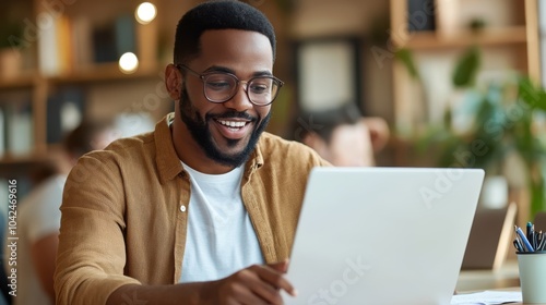 A man sits at a modern café, smiling as he works on his laptop, capturing a mood of productivity and satisfaction in a contemporary, creative environment.