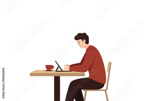 A man sits at a table in a cafe, focused on his laptop. He wears a red sweater and dark pants. A coffee cup sits nearby. Clean, modern aesthetic.