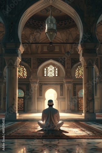 A man sits in contemplation on a rug inside a mosque, surrounded by Islamic architecture and decor