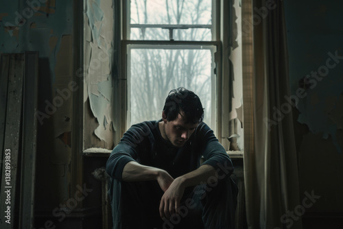 A man sits quietly in a dimly lit room, lost in thought as he looks out of a broken window, surrounded by peeling walls
