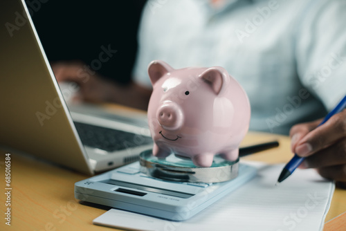 A man sitting at a desk calculates monthly bill expenses online, uses a laptop, makes financial analysis on an account with a pink piggy bank. Saving ideas for the future of investment