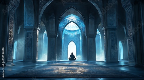 A man sitting in the center of an Islamic mosque, with blue and black colors, prayer room style, realistic illustration.