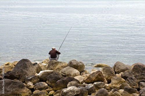 A man sitting on the cobbles and fishing in Adriatic sea in Montenegro.