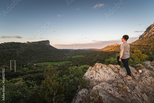 A man standing on the cliff edge, looking over the Pic Saint-Loup and Pic de l'Hortus, two famous mountains in the south Fance