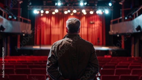 A man stands facing a theater stage with red curtains and bright lights. Empty auditorium, curved walls with lighting, and a chair on a platform below the stage.