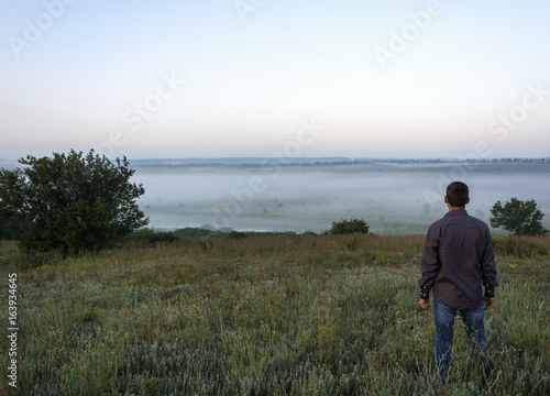 A man stands in a clearing at dawn