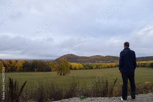 A man stands on the road and looks towards the mountains covered with forest with colorful autumn leaves