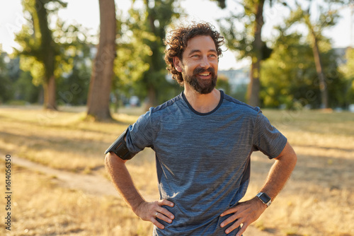 A man stands smiling in a park, hands on his hips, after a refreshing jog. The golden sunlight shines through the trees, highlighting his enjoyment of an active lifestyle.