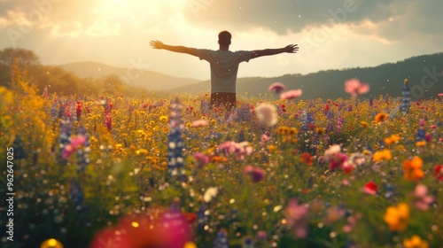 A man stands with open arms in a vibrant field of wildflowers, embracing nature as the golden sunset bathes the landscape in warm light. The scene exudes a sense of freedom, serenity, and connection