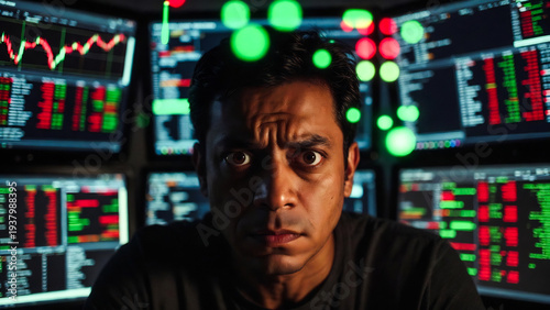 A man stares intensely at multiple stock market monitors, overwhelmed by flashing lights and data. He appears stressed.