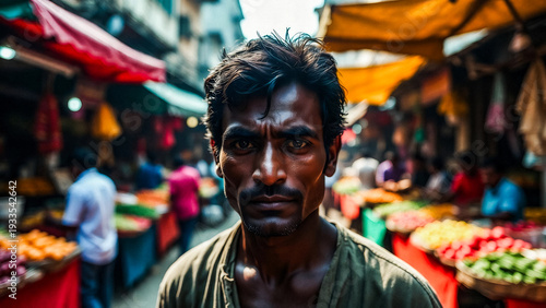 A man stares intensely from a bustling Indian market. He wears simple clothing, displaying a weathered face and focused gaze.