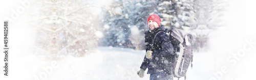 A man travels with a backpack. Winter hike in the forest. Tourist on a walk in the winter in the park.