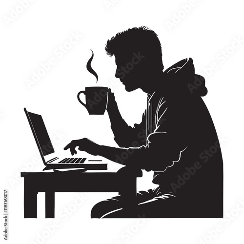 a man using a laptop with a coffee mug silhouette vector illustration isolated on a white background