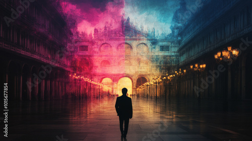 man, walking, street, city, building, light, warm, sky, colourful, hue, dreamlike, silhouetted, mystery, vibrant, saturated, excitement, energy, urban life, night, silhouette, dark, bright, art, illustration