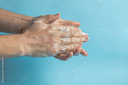 A man washes his hands with soap and uses an antiseptic to clean and disinfect his hands. Virus Prevention, Coronovirus. Hygiene concept hand detail.