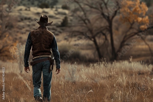 man, person, cowboy, hat, field, grass, landscape, adventure, exploration, walking, hike, nature, wild, countryside, rural, scenery, terrain, agriculture