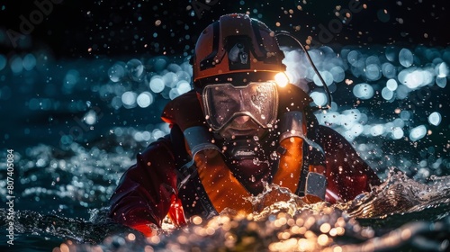 A man wearing a diving suit is submerged in the water, exploring the depths of the sea.
