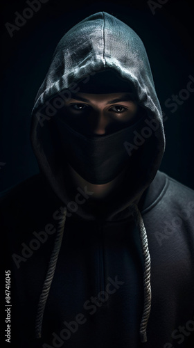 man, hoodie, mask, dark, mystery, intrigue, mysterious, strange, costume, disguise, shadow, obscure, concealment, enigmatic, unknown, hood, face, person, fashion, black, model, eye, people, 1, boy, hooded, hair, horror, studio, man, evil, halloween