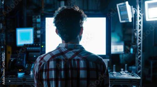 A man wearing a plaid shirt is seen from behind, working on a bright computer screen in a dimly lit tech workspace filled with monitors. AI generated.