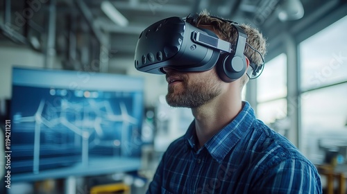 A man wearing a VR headset interacts with digital technology in a modern workspace, showcasing the integration of virtual reality in professional environments.
