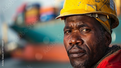 A man wearing a yellow hard hat is standing in front of a ship