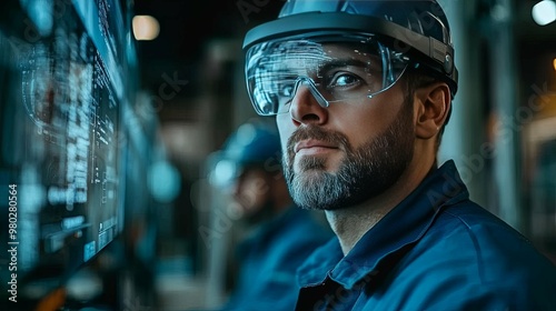 man, men at work, factory, industrial, technology, reality, goggles, goggles, helmet, beard, blue, shirt, uniform, digital, display, screen, interface, datum, information, future, innovation, futuristic, progress, automation, construction, machinery, manufacturing, production, work, hard, hat, face, looking, monitor, safety, eye, sharpened, serious, focused