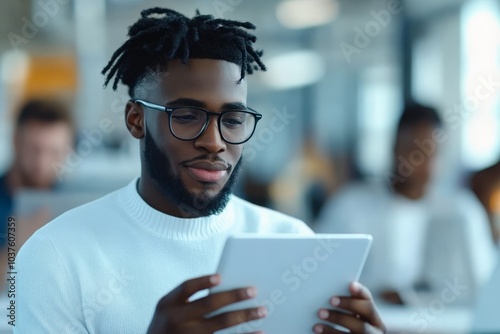 A man wearing glasses and a white sweater is using a tablet while sitting in what appears to be an office setting with soft focus in the background.