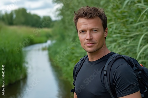 A man with a backpack is standing by a river. He is wearing a black shirt and he is focused on something