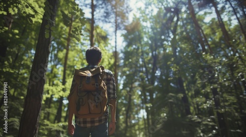 A man with a backpack walking through a forest. Suitable for outdoor and adventure concepts