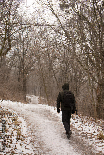 A man with a backpack walks in the park in winter