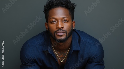 man, beard, gold, necklace, wearing, blue, shirt, looking, person, camera, face, background, portrait, male, young, isolated, guy, attractive, adult, smile, black, confident, african, casual attire, model, serious, photogenic, white, american, happy, lifestyle, expression, cool, fashion, hair, studio, happiness, cheerful, 1, head, modern, standing, business, natural, afro, beauty, human, positive, 1