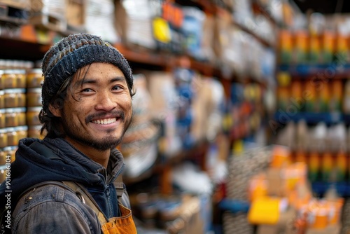 A man with a beard and a hat is smiling in front of a store