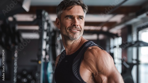 A man with a beard and graying hair wearing a sleeveless top standing in a gym with a confident smile.