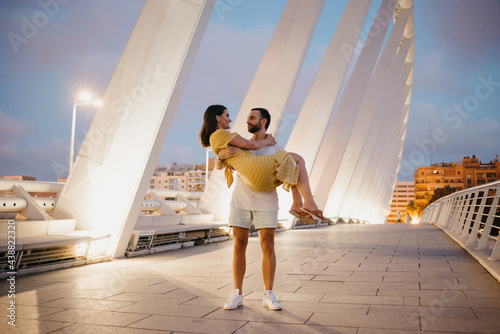 A man with a beard is holding his girl in a yellow dress in his arms on a white bridge in Valencia. A couple of tourists in full length on a date in the warm evening.