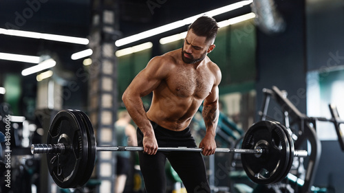 A man with a beard lifts a barbell during a workout in a modern gym.