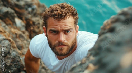 A man with a beard looking determined while climbing a rocky surface near the ocean.