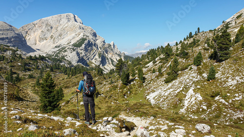 A man with a big hiking backpack hiking in Italian Dolomites. He walks on a very narrow pathway. There are high and stony mountain chains in front. The slopes are overgrown with a few trees. Solitude