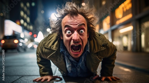 A man with a funny expression on his face is on the street at night. Generative AI.