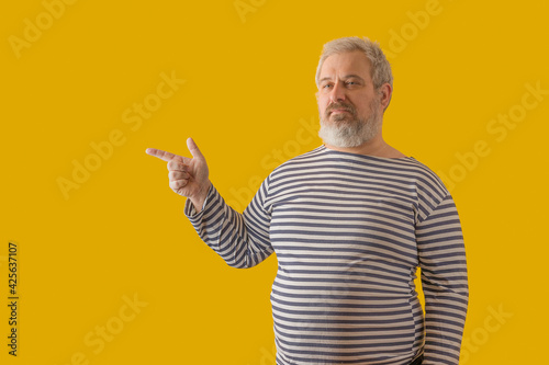 A man with a gray beard, gray hair, wearing a sailor's shirt, shows the "index pointing left" sign. On a yellow isolated background.