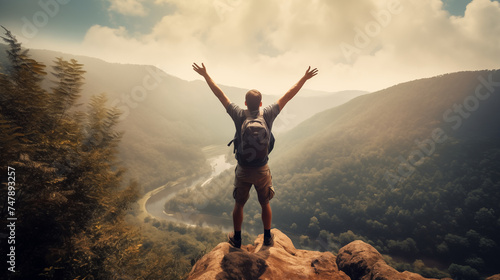 man, person, freedom, joy, success, adventure, nature, mountain, travel, sky, hiking, journey, jump, active, backpack, happy, achievement, free, victory, adult, lifestyle, sunset, summer, top, extreme, cliff, sport, trekking, holiday maker, concept, healthy, arm, peak, silhouette, vitality, young adult, energy, happiness, male, sunlight, climber, hiker, cheerful, hand, excitement, goal, horizontal, inspiration