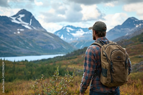 A man with backpack standing in front of mountains, looking at the view, back shot, wearing cap and shirt, outdoor adventure vibe, travel concept