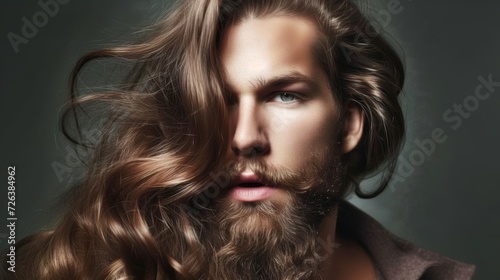 A man with beard and with long hair flying in the wind in fashion editorial style. Men's modern hairstyle