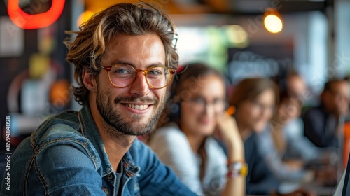 A man with glasses and a denim jacket flashes a cheerful smile while working in a vibrant office. Several colleagues are seated next to him, busy with their tasks.