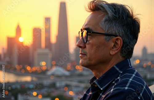 A man with glasses gazes thoughtfully at sunset over a city skyline