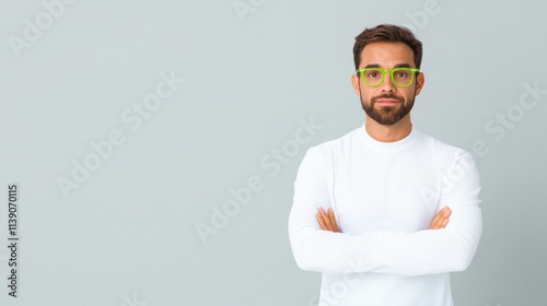 man, goggles, confidence, pose, expression, style, fashion, background, casual attire, portrait, adult, male, emotion, attitude, modern, trendy, serious, relaxed, young, personality, gesture, arm, crossed, white, shirt, green, eyewear, coiffure, facial, feature, light, simple, clean, aesthetic, neutral, calm, approachable, friendly, contemporary, isolated, studio, photo, image, visual, appearance, character, individuality, charme, cool