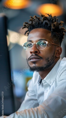 man, goggles, front, computer, screen, sitting, adult, man, male, one person, business, person, businessman, indoor, occupation, working, looking, african, office, young, professional, real, people, part, 1, confidence, portrait, place, work, smiling, adult, happiness, technology, casual attire, clothing, eyeglass, new, afro, copy space, success, design, beard, expertise, lifestyle, american, electronic mail, creative