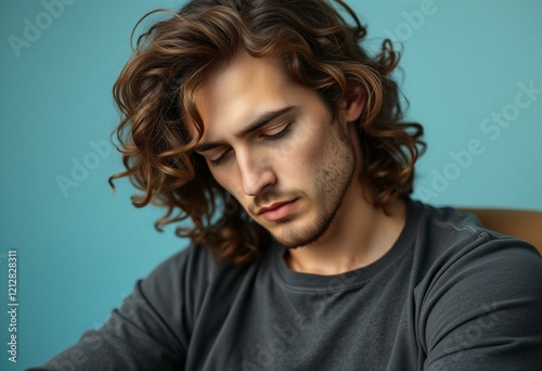 facial, contemplation, relaxed, language, chair, human, introspective, copy, comfortable, emotional, man, partially, people, posture, long, male, closeup, soft, gradient, expression, blue, space, hair, body, eye, curly, brown, portrait, visible