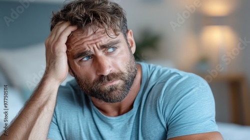 man, blue shirt, short hair, calm, casual attire, indoor, home, serene, introspection, introverted, thoughtful, meditation, soft light, modern, contemporary, bedchamber, bed, chest, arm, light, pensive, to rest, concentration, contemplation, design, fashion, beard, business, young adult, rest, hand, rugged, photogenic, depth, comfort, neck, young