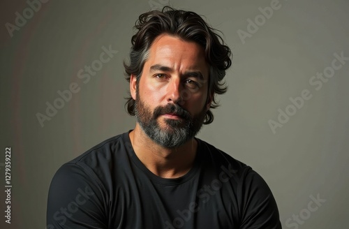 man, beard, hair, contemplation, expression, portrait, neutral, casual attire, thoughtful, posed, wavy, atmosphere, serenity, male, emotion, coiffure, rugged, elegance, confidence, depth, style, minimalist, intimate, lighting, sharpened, gaze, natural, authenticity, modern, chic, cinematic, relaxed, personality, charme, demeanor, attracted, expressionism, subject, mood, character